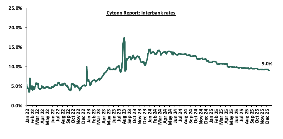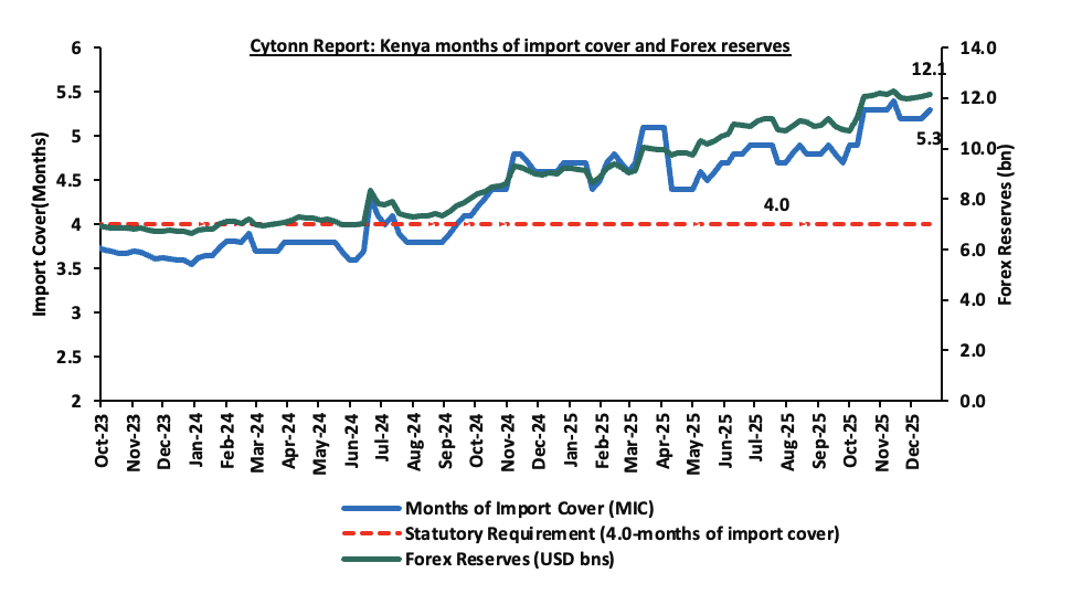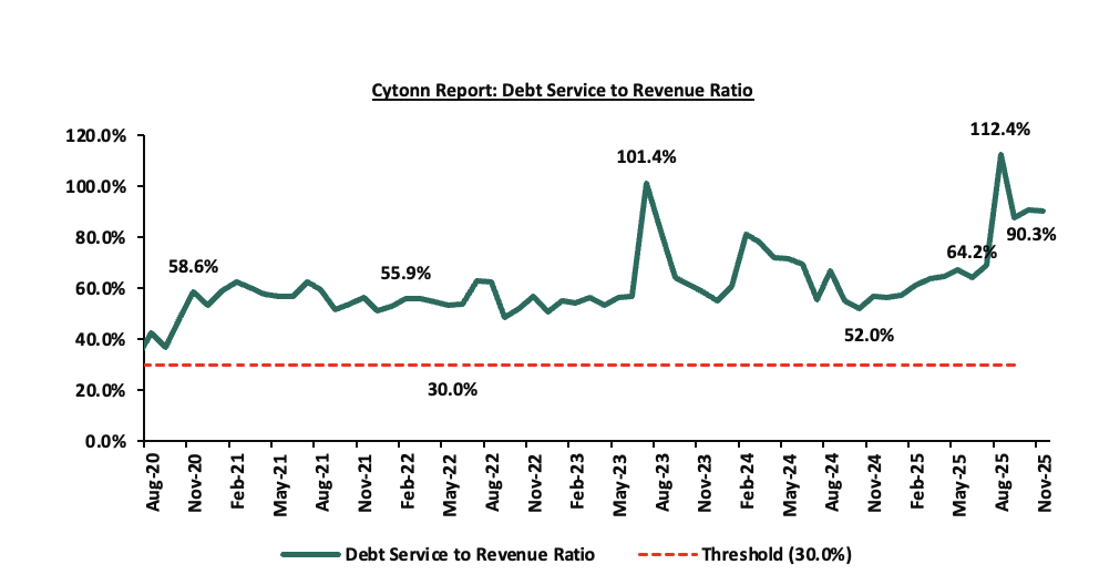 During the week, the National Treasury gazetted the revenue and net expenditures for the fifth month of FY’2025/2026, ending 28th November 2025, highlighting that the total revenue collected as at the end of November 2025 amounted to Kshs 909.8 bn, equivalent to 34.6% of the original estimates of Kshs 2,627.1 bn for FY’2025/2026 and is 83.1% of the prorated estimates of Kshs 1,094.6 bn;