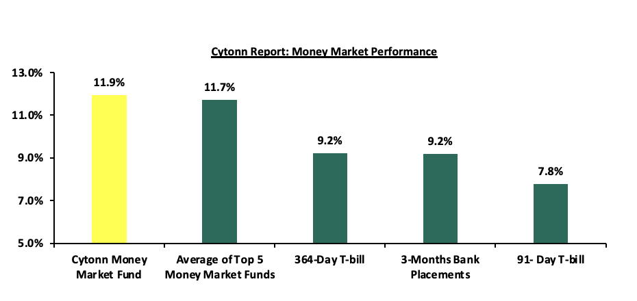 In the money markets, 3-month bank placements ended the week at 9.2% (based on what we have been offered by various banks). The yields on the 364-day and 91-day papers decreased by 0.7 bps and 0.5 bps to 9.23% and 7.77% respectively from the 9.24% and 7.78% recorded the previous week. The yield on the Cytonn Money Market Fund increased by 9.0 bps to 11.94% from the 11.85% recorded in the previous week, while the average yields on the Top 5 Money Market Funds increased by 8.8 bps to 11.7% from 11.6% recorded the previous week.