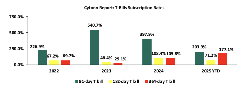 The chart below compares the overall average T-bill subscription rates obtained in 2022,2023, 2024 and 2025 Year-to-date (YTD):