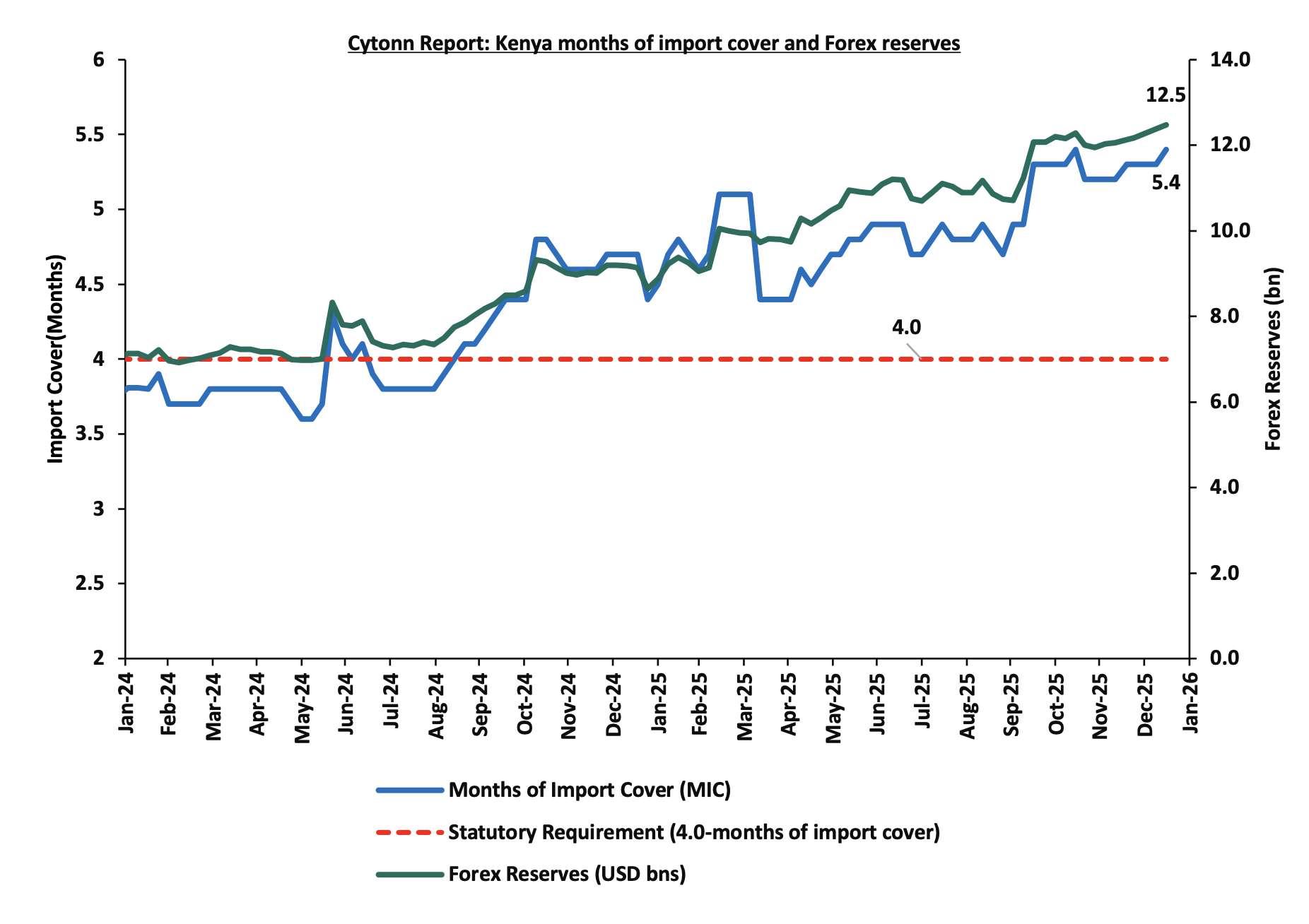 Currency - Our outlook for 2026 is Neutral on Currency. We project the Kenya Shilling to trade against the US dollar within a range of Kshs 129.0 and Kshs 132.0 by the end of 2026, with a bias of 2.3% depreciation against the USD in 2026. We expect the shilling to remain largely stable, supported by record-high forex reserves of USD 12.5 billion (equivalent to 5.4 months of import cover, significantly above the policy target minimum of 4.0 months), effective CBK liquidity management through open market operations, improving diaspora remittances and enhanced export performance. The CBK's demonstrated ability to maintain exchange rate stability through strategic dollar purchases and liquidity management provides a strong foundation for currency stability in 2026;