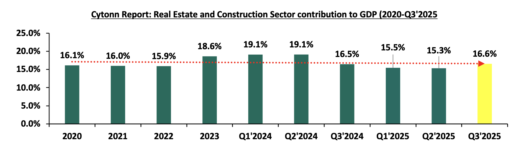 In 2025, the general Real Estate sector continued to witness considerable growth in activity in terms of property transactions and development activities. Consequently, the sector’s activity contribution to Gross Domestic Product (GDP) grew by 5.0 % to Kshs 298.1 bn in Q3’2025, from Kshs 283.8 bn recorded during the same period in 2024. In addition, the sector contributed 10.4% to the country’s GDP, 0.4% points decrease from 10.8% recorded in Q3’2024. Cumulatively, the Real Estate and construction sectors contributed 8.6% to GDP, 0.2% points decrease from 8.8% in Q3’2024, contributable to decline in construction contribution to GDP by 0.2% points, to 5.5% in Q3’2025, from 5.7% recorded in Q3’2024. The graph below highlights the Real Estate and Construction sectors’ contribution to GDP from 2020 to Q3’2025;