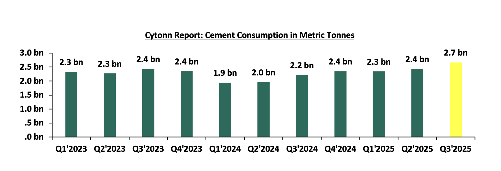 The chart below shows cement consumption in metric tonnes in Kenya between Q1’2023 and Q3’ 2025.