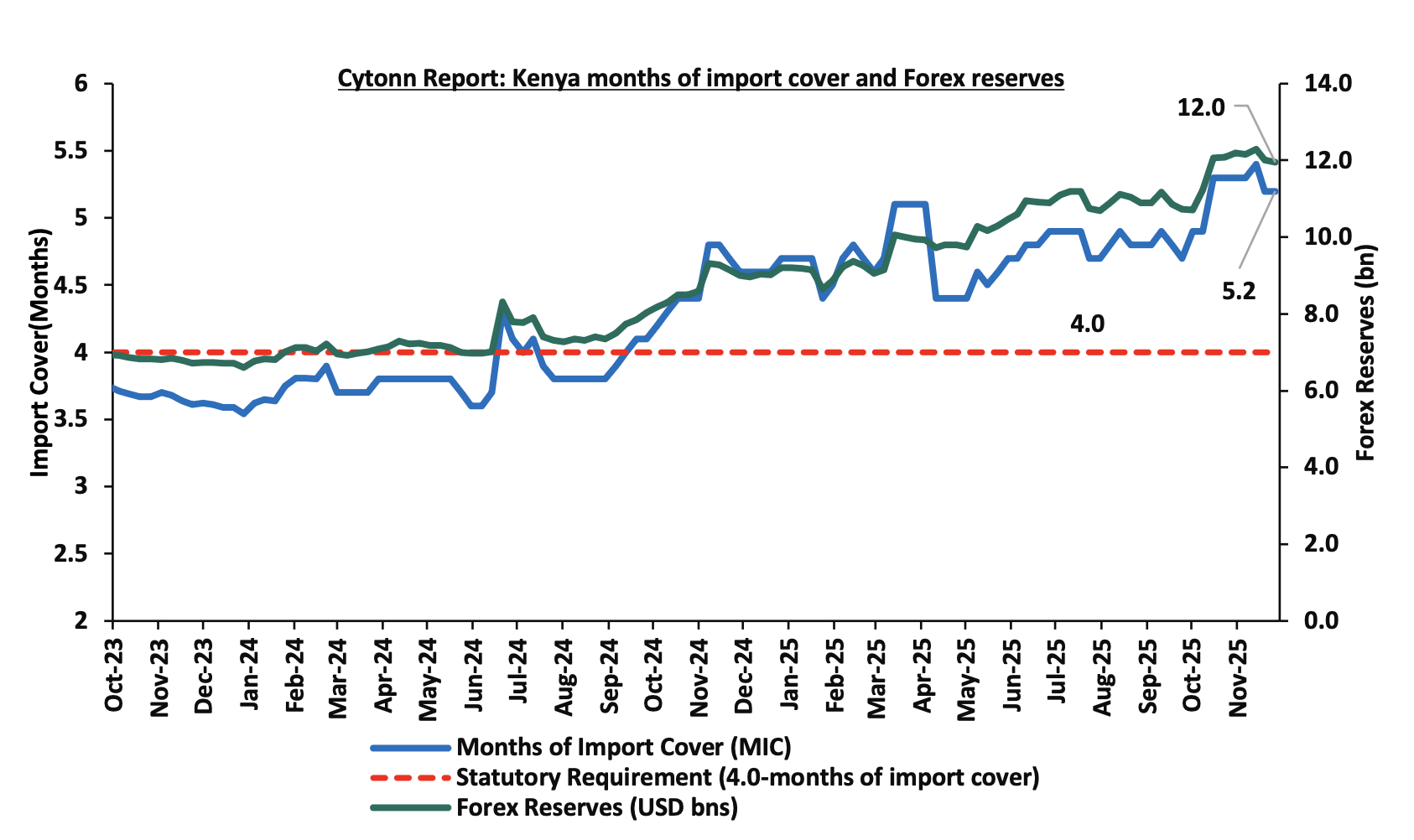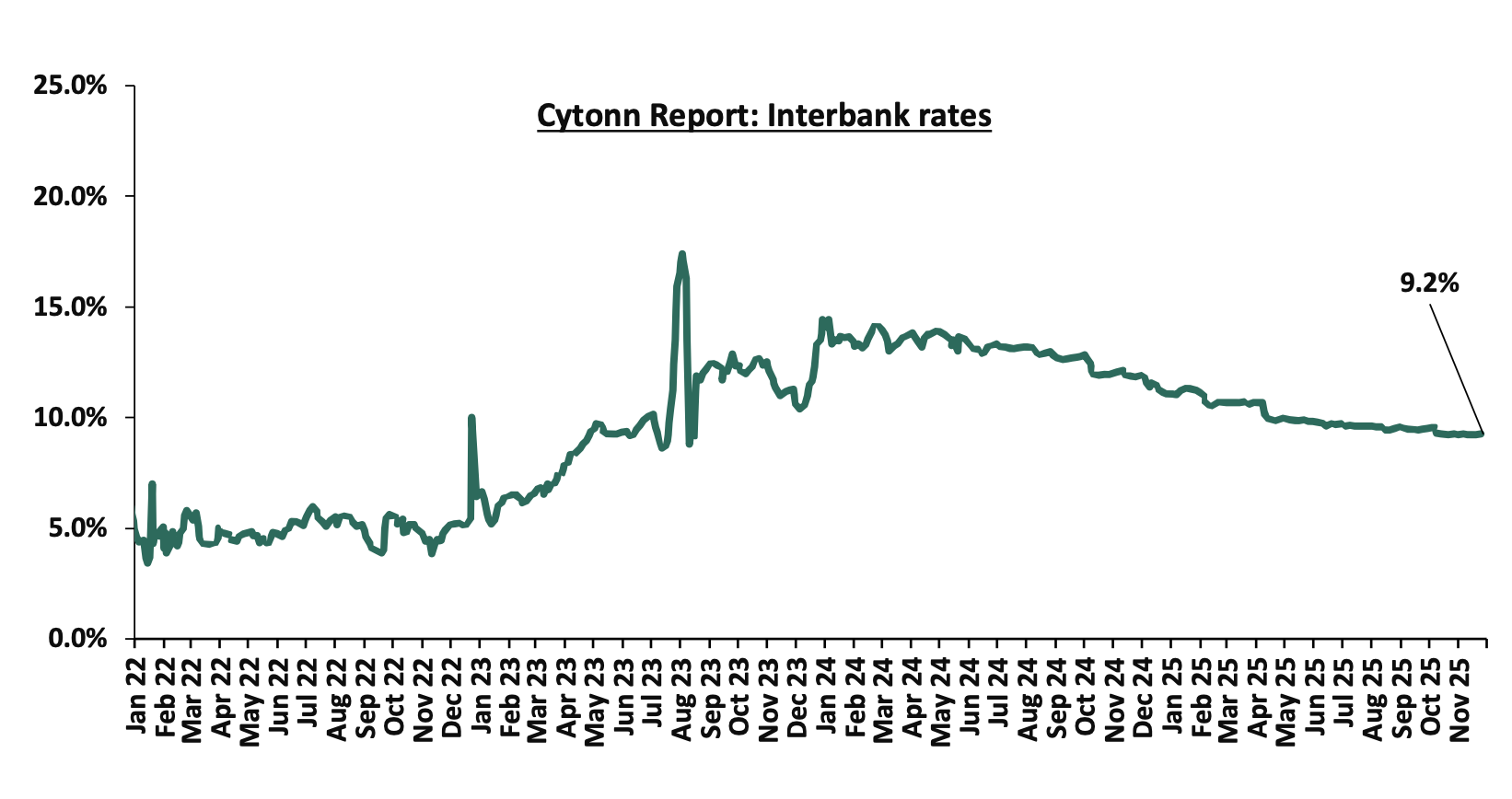 During the week, KNBS reported that year-on-year inflation in November 2025 eased slightly to 4.5% from 4.6% in October, driven by increases in Food & Non-Alcoholic Beverages 7.7%, Transport 5.1%, and Housing, Water, Electricity, Gas and Other Fuels 1.9%. Month-on-month inflation was modest at 0.2%, indicating relative price stability;