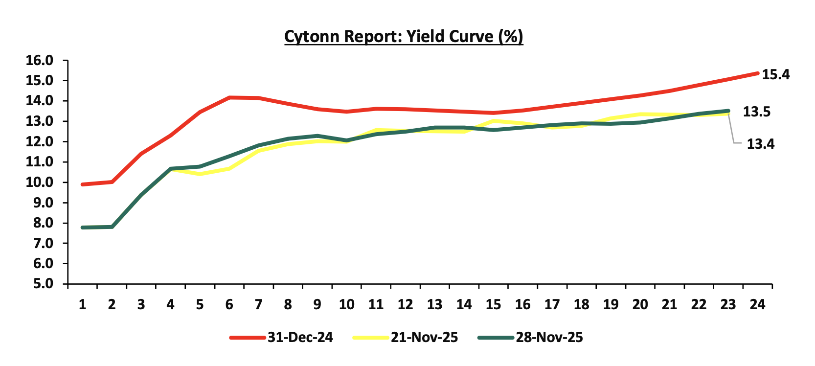 Additionally, November 2025 bonds were oversubscribed, with the overall average subscription rate coming in at 261.0%, higher than the average subscription rate of 237.8% recorded in October 2025. The reopened bonds FXD3/2019/015, FXD1/2022/025, FXD1/2012/020 and FXD1/2022/015 with tenors to maturity of 8.7 years, 21.9 years, 7.0 years and 11.4 years respectively and fixed coupon rates of 12.3%, 14.2%, 12.0% and 13.9% respectively, received bids worth Kshs 208.8 bn against the offered Kshs 80.0 bn translating to an oversubscription rate of 261.0%. The government accepted bids worth Kshs 107.6 bn, translating to an acceptance rate of 51.5%. The weighted average yield for the accepted bids for the FXD3/2019/015, FXD1/2022/025, FXD1/2012/020 and FXD1/2022/015 came in at 12.6%, 13.7%, 12.5% and 13.3% respectively.