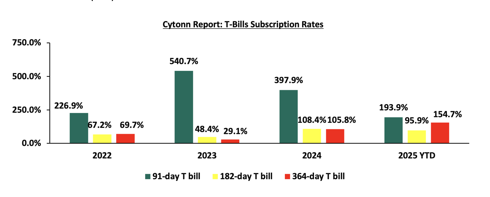 The chart below compares the overall average T-bill subscription rates obtained in 2022,2023, 2024 and 2025 Year-to-date (YTD):