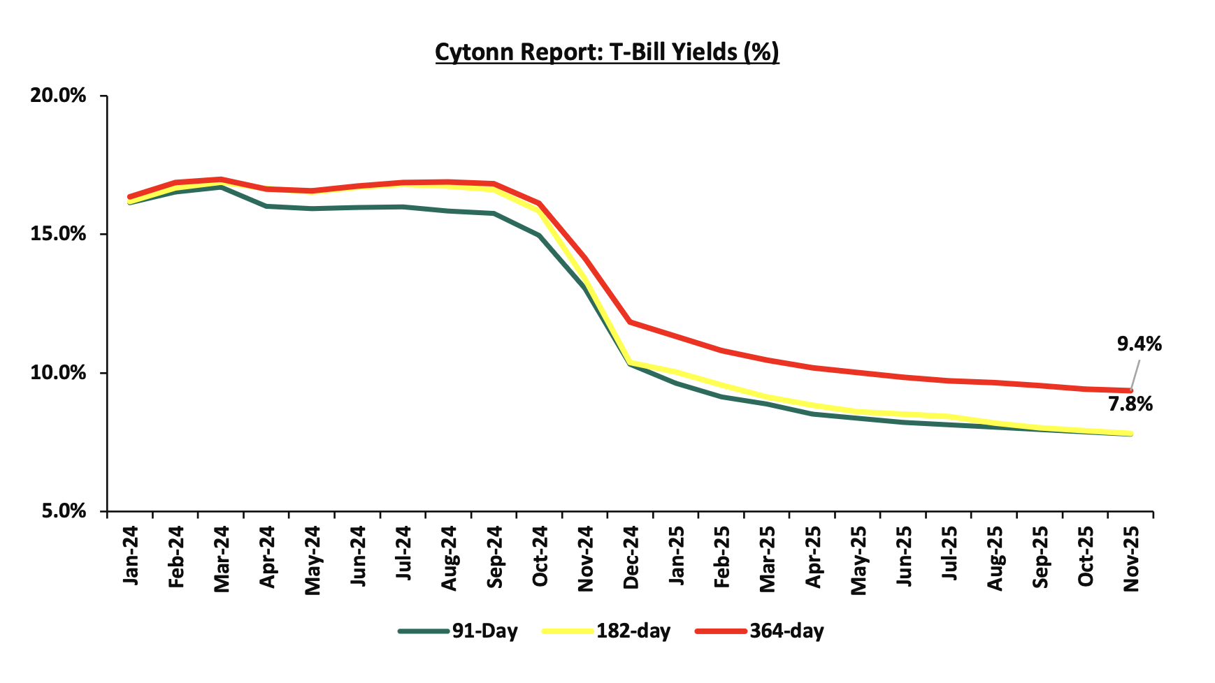 During the month of November 2025, T-bills were oversubscribed, with the overall average subscription rate coming in at 143.8%, higher than the subscription rate of 97.6% recorded in October 2025. The overall average subscription rates for the 91-day and 364-day papers increased to 232.5% and 222.0% from 136.6% and 133.2% recorded in October 2025 respectively while the subscription rates for the 182-day paper decreased to 30.2% from the 46.4% and recorded in October 2025. The average yields on the government papers were on a downward trajectory during the month, with the average 182-day, 91-day and 364-day papers yields decreasing by 10.1 bps, 8.4 bps, and 5.5 bps to 7.8%, 7.8% and 9.35% respectively, from an average of 7.9%, 7.9% and 9.41% recorded the previous month. For the month of October, the government accepted a total of Kshs 137.9 bn of the Kshs 138.0 bn worth of bids received in T-Bills, translating to an acceptance rate of 99.9%, compared to an acceptance rate of 99.6% in the month of October;