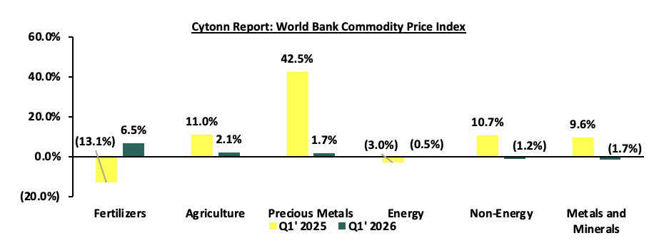 Global commodity prices registered mixed performance in Q1’2026, with prices of energy declining by 0.5%, lower than the 3.0% decrease recorded in Q1’2025, mainly as a result of the declining energy production and exports among oil-importing economies coupled with increased geopolitical tensions in the Middle East that caused disruption on the supply. Additionally, prices of non-energy and metals and minerals declined by 1.2% and 1.7% compared to the 10.7% and 9.6% increase recorded in Q1’2025 respectively due to persistent trade tensions and policy uncertainty which affect overall demand. Prices of Fertilizers, Agriculture and Precious metals increased by 6.5%, 2.1% and 1.7% respectively, on the back of geopolitical tensions (especially in the Middle East), extreme weather impacting crop yields, rising input costs for fertilizers, and strong demand from clean-energy sectors. Tariffs and supply disruptions have further fueled these increases. Below is a summary performance of various commodities;