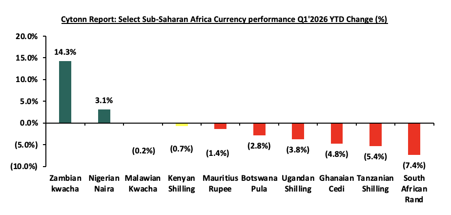 In Q1’2026, most of the select Sub-Saharan currencies depreciated against the US Dollar, primarily due to elevated inflationary pressures in the region, high debt servicing costs that continued to deplete foreign exchange reserves, and monetary policy tightening by advanced economies. High interest rates in developed countries resulted in significant capital outflows as investors, both institutional and individual, sought higher returns offered in these economies. However, the Zambian Kwacha emerged as the best performer among the selected currencies, appreciating by 14.3% against the USD on a year-to-date basis, closing Q1'2026 at ZMW 19.0 from ZMW 22.2 at the beginning of the year. Below is a table showing the performance of select African currencies against the US Dollar:
