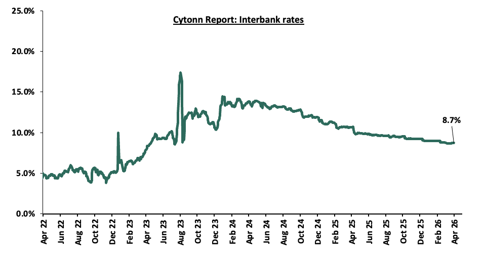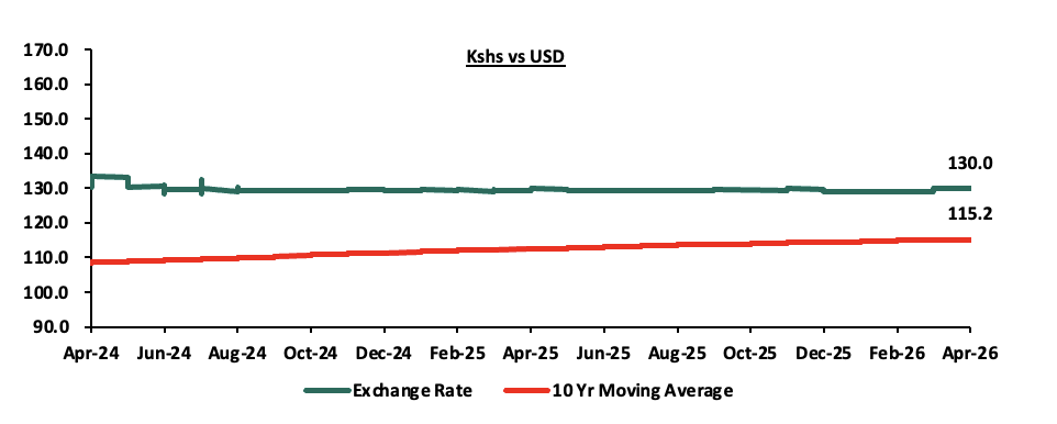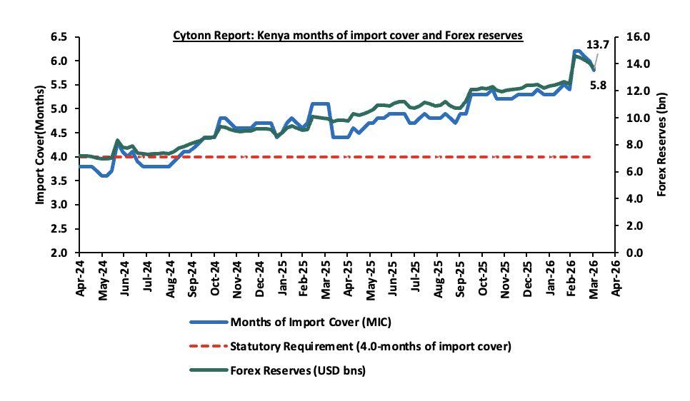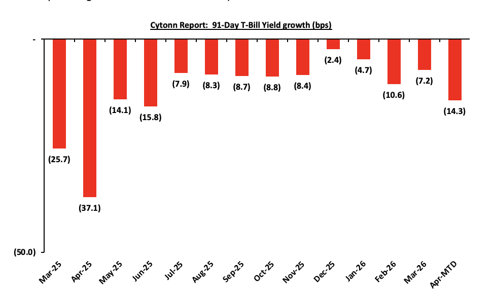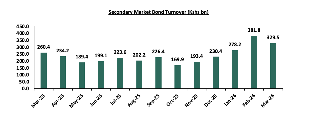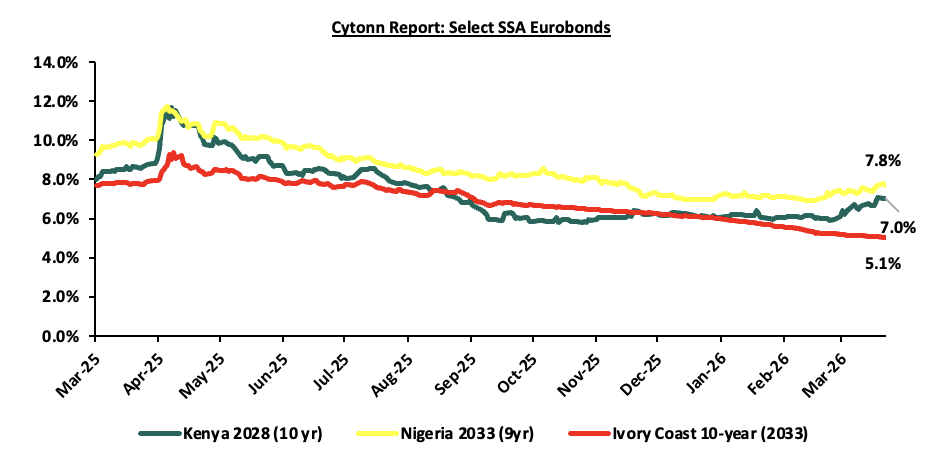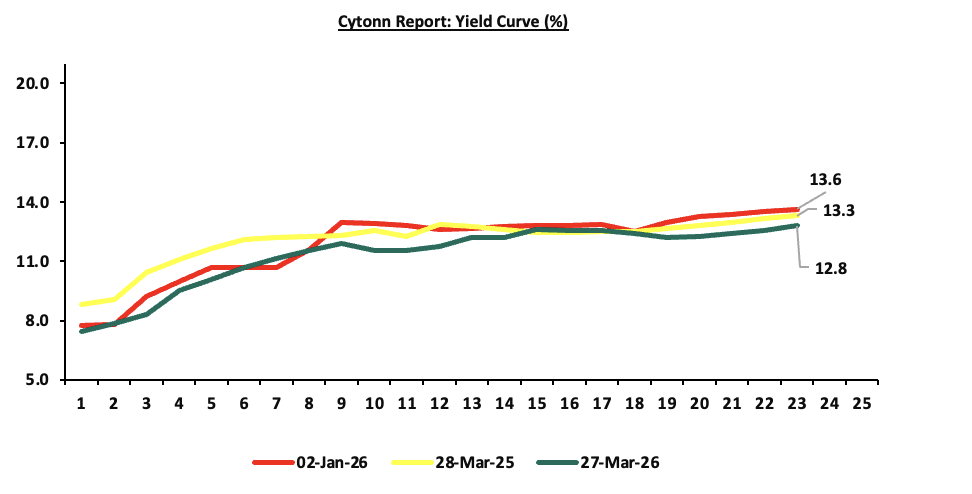 During the week, the Central Bank of Kenya released the auction results for the re-opened treasury bonds FXD1/2020/015 and FXD1/2018/025 with tenors to maturities of 8.9 years and 17.3 years respectively and fixed coupon rates of 12.8% and 13.4% respectively. The bonds were oversubscribed, with the overall subscription rate coming in at 187.2%, receiving bids worth Kshs 74.9 bn against the offered Kshs 40.0 bn. The government accepted bids worth Kshs 50.2 bn, translating to an acceptance rate of 67.0%. The weighted average yield for the accepted bids for the FXD1/2020/015 and FXD1/2018/025 came in at 12.2% and 13.0% respectively. Notably, the 12.2% yield on FXD1/2020/015 was lower than the 13.7% recorded at its last reopening in April 2025. Similarly, the 13.0% yield on FXD1/2018/025 was lower than the 13.4% recorded at its last reopening in February 2026. With the Inflation rate at 4.4% as of March 2026, the real returns of the FXD1/2020/015 and FXD1/2018/025 are 7.8% and 8.6%. Given the 10.0% withholding tax on the bonds, the tax equivalent yields for shorter term bonds with 15.0% withholding tax are 12.9% and 13.8% for the FXD1/2020/015 and FXD1/2018/025 respectively;