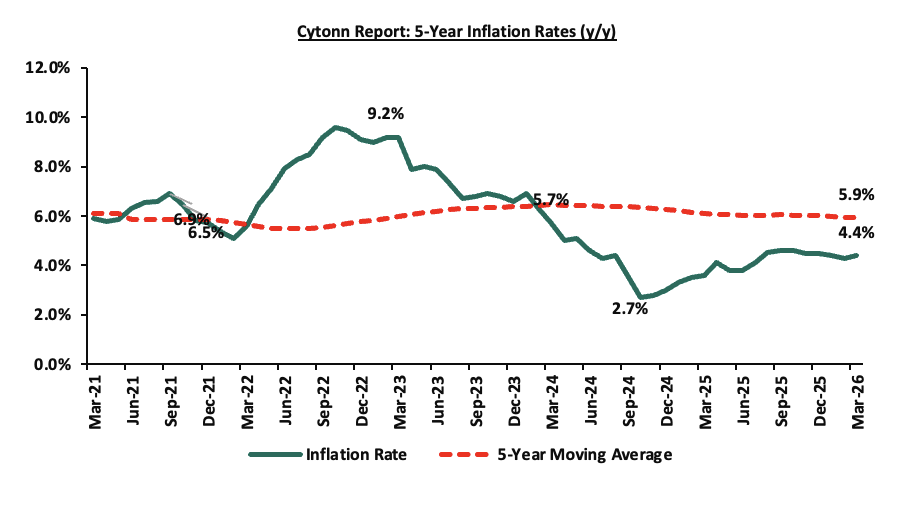 The year-on-year inflation in March 2026 increased by 0.1% points to 4.4% from the 4.3% recorded in February 2026 which is in line with our projection of an increase to a range of 4.4%-4.6%. The price increase was primarily driven by a by a rise in prices of items in the Food and Non-alcoholic Beverages at 7.7%; Transport 3.8%; and Housing, Water, Electricity, Gas and other fuels at 2.0%; over the one-year period;