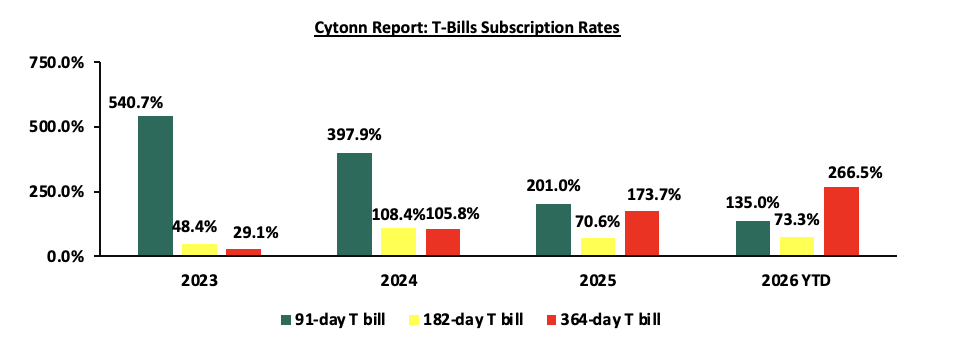 During Q1’2026, T-bills were oversubscribed, with the overall subscription rate coming in at 196.1%, up from 136.1% in Q1’2025. Investors’ preference for the 91-day paper persisted with the paper receiving bids worth Kshs 88.9 bn against the offered Kshs 52.0 bn, translating to an oversubscription rate of 170.9%, albeit lower than the oversubscription rate of 221.1% recorded in Q1’2025. Overall subscription rates for the 364-day papers came in at 334.3% which was higher than the 140.4% recorded in Q1’ 2025, while that for 182-day papers came in at 67.9% which was lower than the 97.8% recorded in Q1’2025. The average yields on the 364-day, 182-day and 91-day papers decreased by 1.9%, 1.7% and 1.6% points to 8.9%, 7.8% and 7.6% in Q1’2026, respectively, from 10.8%, 9.5% and 9.2%, respectively, in Q1’2025. The downward trajectory in yields is primarily driven by improved investor confidence, stemming from reduced credit risk in the country and relatively eased inflationary pressures. This has lowered the risk premium demanded by investors. During the period, the acceptance rate stood at 72.8%, down from 86.4% in Q1’2025, with the government accepting Kshs 445.3 bn out of the Kshs 611.8 bn worth of bids received;