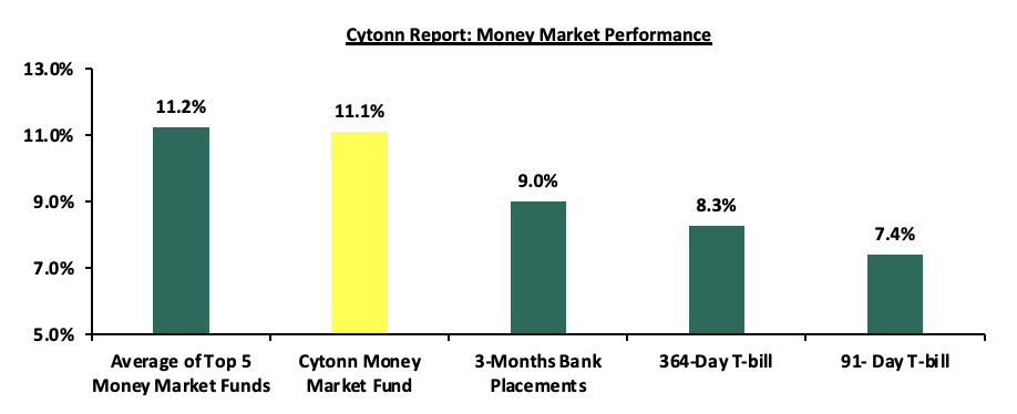 During the week, the equities market was on an upward trajectory, with NSE 10, NSE 25, NASI and NSE 20 gaining by 2.2%, 2.1%, 1.9%, and 1.8%, respectively, taking the YTD performance to gains of 10.8%, 7.9%, 6.4% and 4.9% for NSE 20, NSE 25, NASI, and NSE 10 respectively. The equities market performance was mainly driven by gains recorded by large-cap stocks such as Absa, Cooperative Bank and Stanbic Bank, of 8.8%, 6.3%, and 6.1%, respectively. The gains were however weighed down by losses recorded by large cap stocks such as EABL and DTB-K of 1.2% and 0.5% respectively;