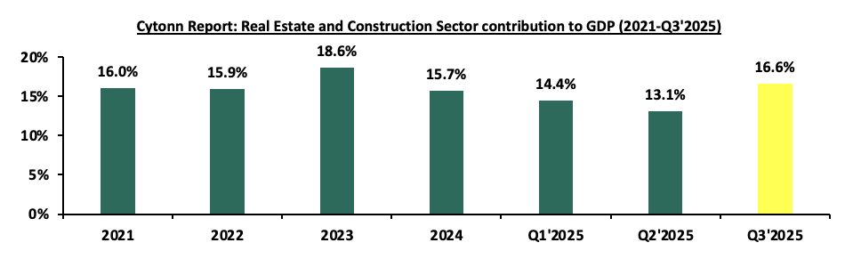 In Q1’2026, the general Real Estate sector continued to witness considerable growth in activity in terms of property transactions and development activities. Consequently, the sector’s activity grew by 7.6 % to Kshs 368.7 bn in Q3’2025, from Kshs 342.6 bn recorded during the same period in 2024. In addition, the sector contributed 8.6% to the country’s GDP, 2.2% points decrease from 10.8% recorded in Q3’2024. Cumulatively, the Real Estate and construction sectors contributed 16.6% to GDP, 0.1% points increase from 16.5% in Q3’2024, attributable to increase in construction contribution to GDP by 1.0% points, to 6.7% in Q3’2025, from 5.7% recorded in Q3’2024. The graph below highlights the Real Estate and Construction sectors’ contribution to GDP from 2020 to Q3’2024;