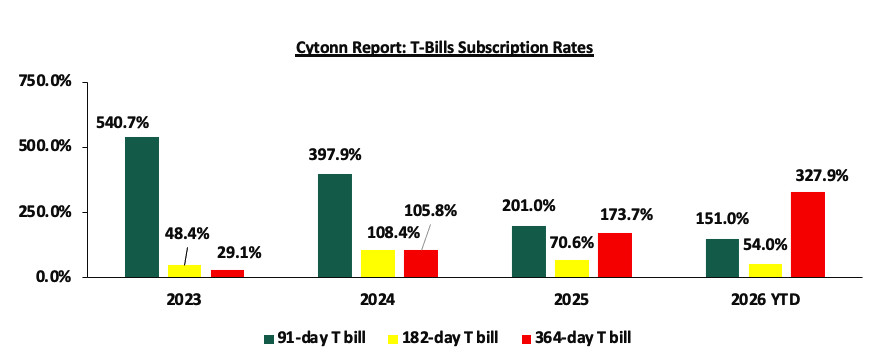 The chart below compares the overall average T-bill subscription rates obtained in 2023, 2024, 2025 and 2026 Year-to-date (YTD):