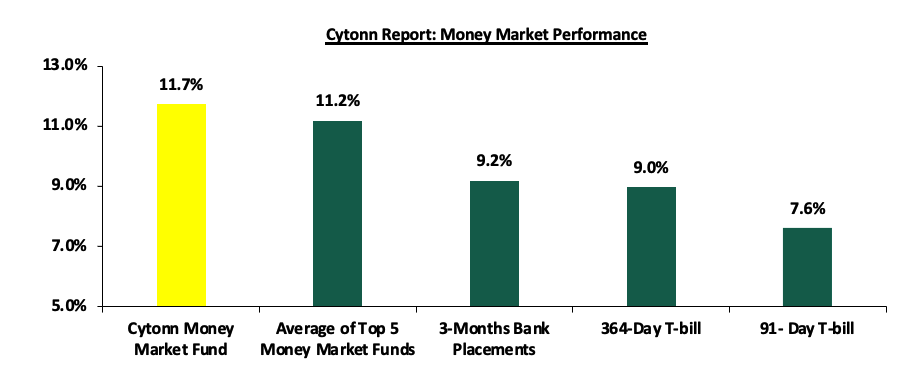 In the money markets, 3-month bank placements ended the week at 9.2% (based on rates offered by various banks), while yields on government papers recorded a downward performance, with the 364-day paper declining the most by 22.4 bps to 9.0% from 9.2% the previous week, and the 91-day paper decreasing marginally by 2.0 bps to remain relatively unchanged at 7.6% in comparison to last week. The yield on the Cytonn Money Market Fund decreased by 7.0 bps to 11.7% from 11.8% the previous week, while the average yields on the Top 5 Money Market Funds declined by 36.8 bps to 11.2% from 11.6% recorded the previous week.