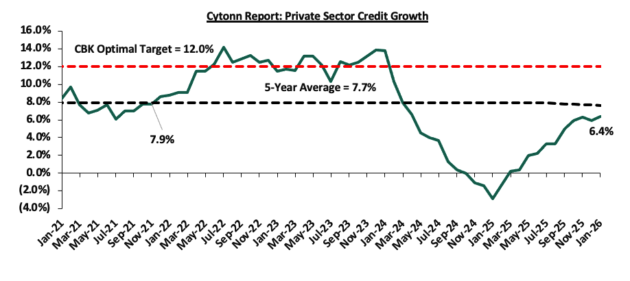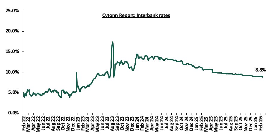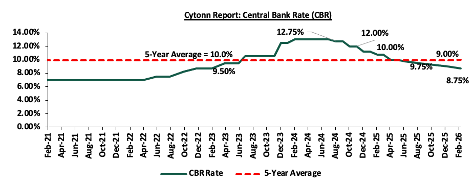 The monetary policy committee met on February 10th, 2026, to review the outcome of its previous policy decisions and decided to lower the CBR rate by 25.0 bps to 8.75%, from 9.00% in December 2026. Notably, inflation rates remain anchored and remained within the CBK preferred range of 2.5%-7.5% for the thirty first consecutive month, with a decrease of 0.1% points to 4.4% in January 2026, from 4.5% in December 2025. Key to note, the MPC had cut the CBR rate to 9.00% in the previous meeting in December from 9.25% in October 2025;