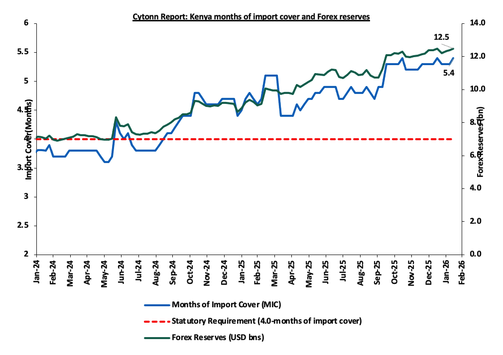 Improving forex reserves having increased by a significant 33.2% to USD 12.5 bn (equivalent to 5.4 months of import cover) in February 2026, from USD 9.4 bn (equivalent to 4.8 months of import cover) in a similar period in 2025. Notably, for the last six months, forex reserves have remained above the statutory requirement of maintaining at least 4.0-months of import cover. The increase is largely attributed to decreased debt service obligations due to the continued stability of the Kenyan shilling. The chart below shows the trend of the evolution of the forex reserves: