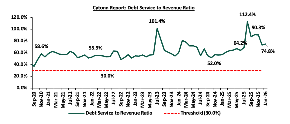 During the week, the National Treasury gazetted the revenue and net expenditures for the seventh month of FY’2025/2026, ending 30th January 2026, highlighting that the total revenue collected as at the end of January 2026 amounted to Kshs 1,437.2 bn, equivalent to 52.2% of the original estimates of Kshs 2,754.7 bn for FY’2025/2026 and is 89.4% of the prorated estimates of Kshs 1,606.9 bn;