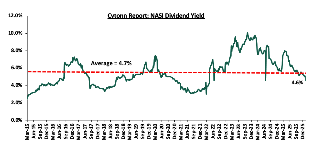 The yields on the government papers continue to decline in 2026, with the yields on the 91-day paper recording a YTD decline of 11.9 bps to 7.6% as of 12th February 2026, from the 7.7% recorded at the start of the year. The yields on the 364-day and 182-day papers have declined by 23.4 bps and 3.0 bps respectively on a YTD basis to 9.0% and 7.8% as of 12th February 2026, from the 9.2% and 7.8% respectively recorded at the start of the year.