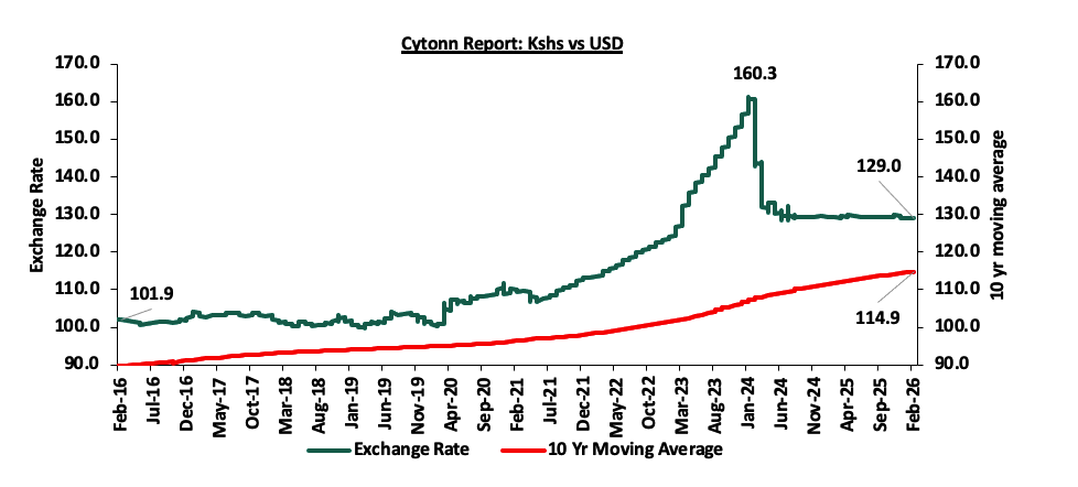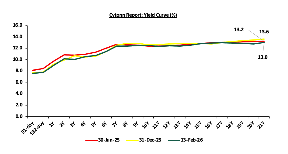The Kenyan Shilling has experienced a marginal Year-to-Date negligible appreciation of 2.3 bps against the US Dollar, closing the week at Kshs 129.0 as of February 13, 2026, compared to Kshs 129.1 at the beginning of the year. This is an addition to the 22.9 bps appreciation in 2025. The appreciation experienced in 2025 and the current stability of the Shilling is supported by improved forex reserves currently at USD 12.5 bn (equivalent to 5.4-months of import cover), an increase of 33.3% from USD 9.3 bn (equivalent to 4.8-months of import cover) recorded in a similar period in 2025, and an 1.2% increase in diaspora remittances to USD 5,020.7 mn in the twelve months to January 2026 higher than USD 4,960.2 mn recorded in a similar period in 2025. The Kenyan macroeconomic environment challenges have alleviated as evidenced by credit rating outlook revision by Moody’s. In February 2026, Moody’s announced its revision of Kenya’s credit outlook to B3 Stable from Caa1 Positive, on the back of a reduction in near-term default risk and strengthened external liquidity. However, the previous Positive outlook had already indicated a high probability of an upgrade, the move largely formalizes that expectation, while the shift to a Stable outlook signals that further upgrades are unlikely in the near term as risks remain balanced at the new rating level. Fitch Ratings affirmed Kenya's Long-Term Foreign-Currency Issuer Default Rating (IDR) at 'B-' with a Stable Outlook in January 2026. This rating is supported by robust medium-term growth prospects, a diverse economy, continued access to multilateral and bilateral financing and improved external liquidity buffers, despite elevated public debt levels and ongoing fiscal pressures. However, the rating is limited by persistent vulnerabilities such as high external debt service, reliance on concessional borrowing and limited fiscal space. Additionally, an affirmed rating reduces concerns and improves investor confidence, leading to a reduced flight from the local currency. Over the past twelve months, Kenya’s Eurobond Yields have been on a downward trajectory, decreasing by a cumulative average of 247.7 bps reflecting improved investor confidence and a more favourable economic outlook. Investors are getting lower returns due to reduced perceived risks, in turn decreasing demand for foreign currencies and, consequently, the appreciation of the Kenyan Shilling. The currency stability, anchored inflationary pressures, reduced credit risk, coupled with reduced Central Bank Rates has led to decreased yields on government securities.