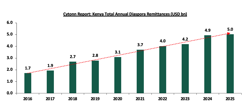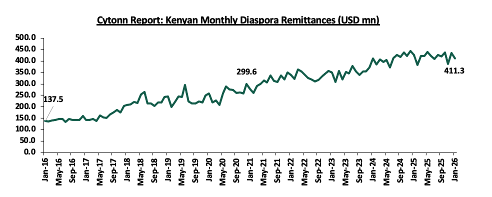 Strong diaspora remittances, with monthly diaspora remittances having grown at a 10-year CAGR of 11.6% to USD 411.3 mn in January 2026, from USD 137.5 mn recorded in January 2016. In the 12 months to January 2026, the Diaspora remittances stood at a cumulative USD 5,020.7 mn which is 1.2% higher than the USD 4,960.2 mn recorded over the same period in 2025. The continued growth in diaspora remittance is mainly attributable to the recovery of the of the global economy, increasing Kenyan population in the diaspora and advancing technology that has facilitated easier transfer of money. The charts below show the trend of the evolution of monthly and annual Diaspora Remittances;