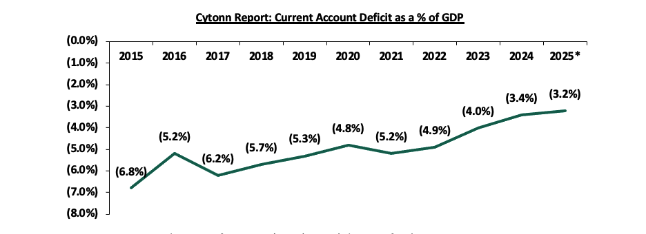 The narrowing of the current account deficit due to the increased value and volumes of the country’s principal exports relative to the import bill, with total exports increasing by 2.5% in Q3’2025, compared to a 7.4% growth in imports over the same period in 2024. It is good to note that there has been a positive trend with the current account deficit coming at 3.2% of GDP in Q3’2025. Notably, exports of edible products grew the most by 32.7% in Q3’2025, to Kshs 4.1 bn from Kshs 3.1 bn in Q3’2024. Also, in Q3’2025, tea exports and horticulture contributed Kshs 44.9 bn and Kshs 52.0 bn, respectively, to the total export value of Kshs 289.4 bn. This also, marked an 0.4% increase in tea export earnings from Kshs 44.7 bn in a similar period last year, while horticulture saw a 3.3% increase from Kshs 50.3 bn in Q3’2024.