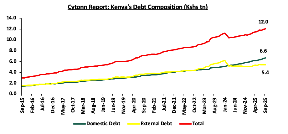 The high debt levels in the country with the Kenya’s public debt having grown at a 10-year CAGR of 15.2% to Kshs 12.1 tn in September 2025, from Kshs 2.9 tn in September 2015, with external debt accounting for 44.7% of the total debt. This continues to put pressure on our foreign reserves due to the burden of high debt servicing costs and hence continues to weigh down on the Kenyan shilling. The chart below highlights the trend in the country’s debt composition:
