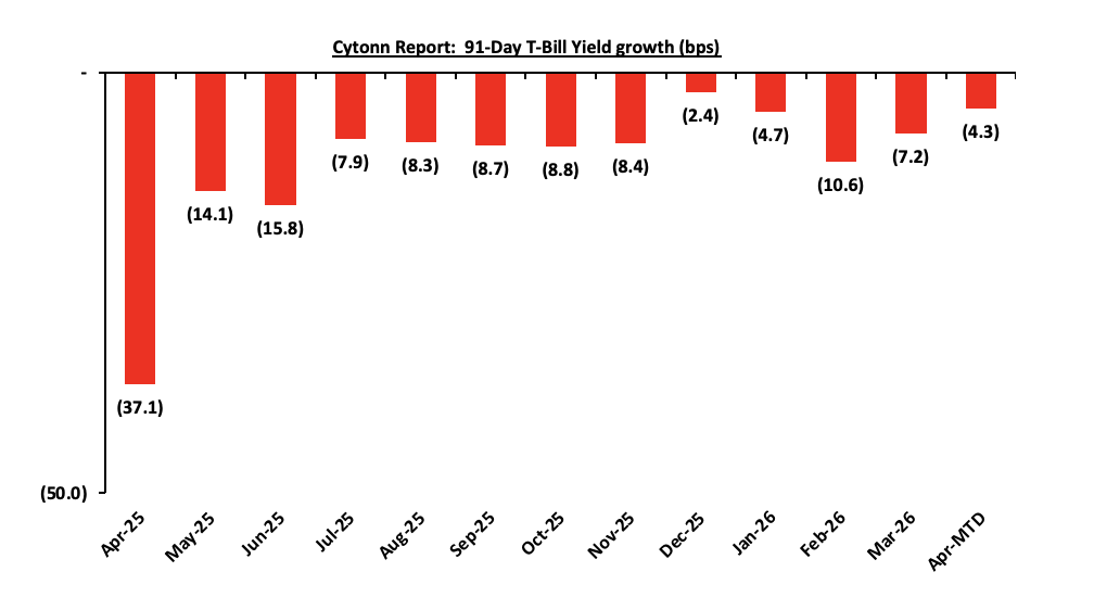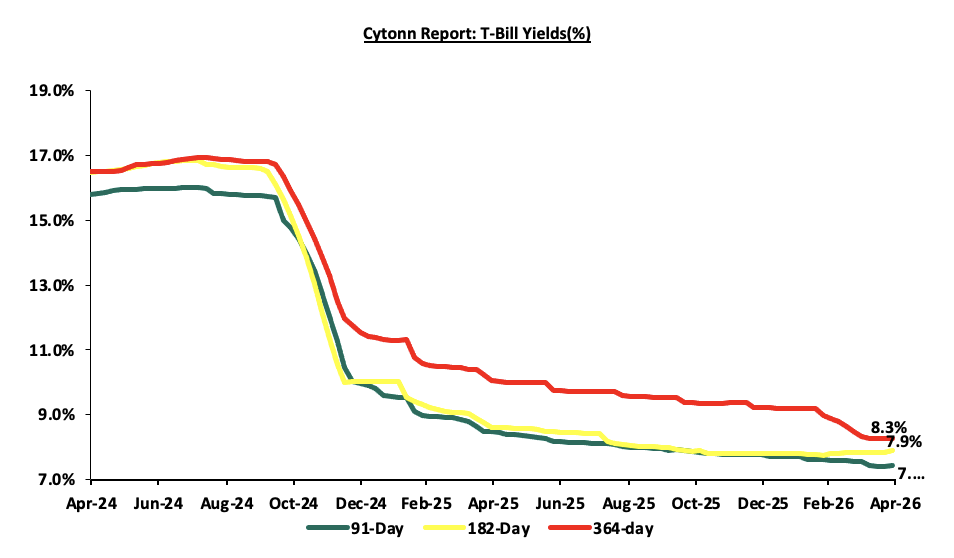 The chart below shows the performance of the 91-day, 182-day and 364-day papers from April 2024 to April 2026