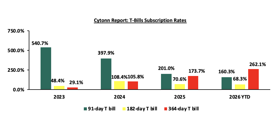 The chart below compares the overall average T-bill subscription rates obtained in 2023, 2024, 2025 and 2026 Year-to-date (YTD):