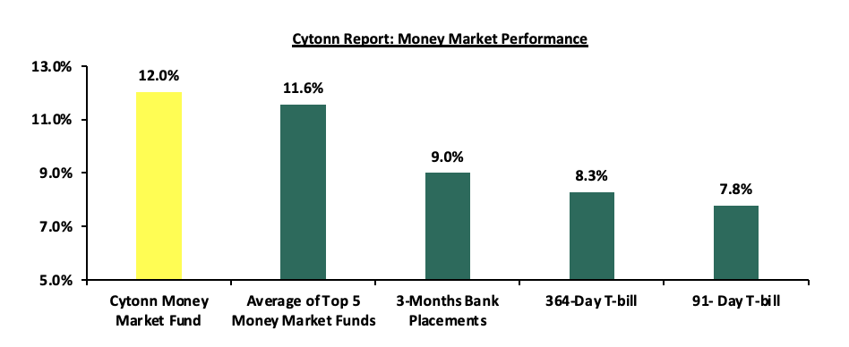 In the money markets, 3-month bank placements ended the week at 9.0% (based on rates offered by various banks. The yields on the government papers recorded a mixed performance with the yields on the 91-day paper increasing by 35.5 bps to 7.8% from the 7.5% recorded the previous week, while the yields on the 364-day paper decreased by 0.1 bps to remain relatively unchanged from the 8.3% recorded the previous week. The yield on the Cytonn Money Market Fund increased by 80.0 bps to 12.0% from 11.2% recorded the previous week, while the average yields on the Top 5 Money Market Funds increased by 25.6 bps to 11.6% from 11.3% recorded the previous week.