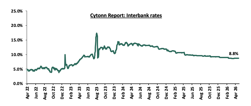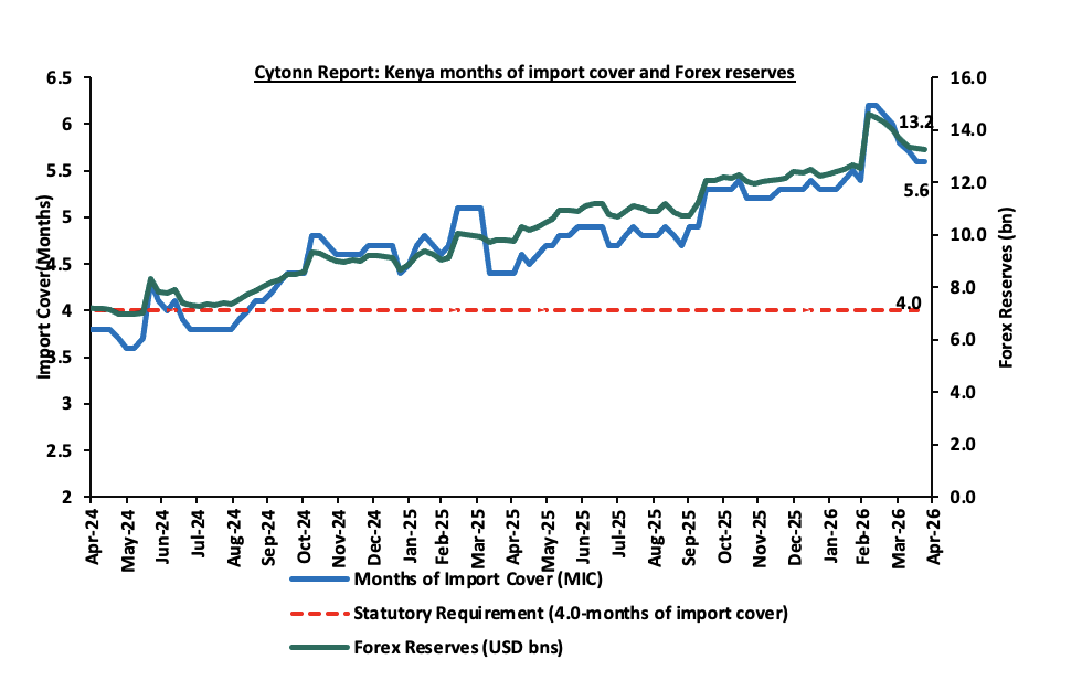 The government is also looking to raise Kshs 10.0 bn through the switch auction from bond issue FXD1/2017/010 to FXD1/2021/020 with fixed coupon rates of 13.0% and 13.4% respectively and tenors to maturity of 1.2 years and 15.2 years respectively. The period of sale for the two bonds opened on Thursday 23rd April 2026 and will close on Monday 18th May 2026. Our bidding ranges for the switch to FXD1/2021/020 from FXD1/2017/010 is 12.50%-13.00%;