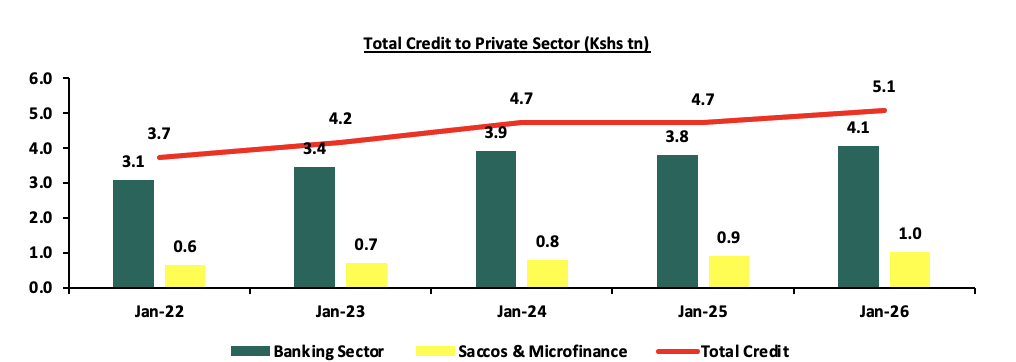 The private sector contributes significantly to Kenya's economic growth, with increased access to credit driving real GDP expansion. Credit availability is essential for businesses to expand, innovate, and stay competitive. Recent data from the Central Bank of Kenya (CBK) shows that credit to the private sector expanded by 8.1% as of March 2026, reflecting the impact of lowering of the Central Bank Rate by CBK which has in turn made the cost of borrowing cheaper. As the government aims to reduce its fiscal deficit, fostering a supportive environment for private sector growth, especially for micro, small, and medium enterprises (MSMEs), will be crucial for increasing revenue collection. Achieving this requires policy reforms to strengthen the credit market and the introduction of sector-specific funds to drive business growth in key industries like finance, agriculture, manufacturing, and transport. Compared to developed economies, Kenya's private sector faces limited credit access, relying heavily on commercial banks with minimal availability of alternative financing options such as venture capital, equity financing, or government-backed credit programs. According to Central Bank of Kenya, banks continue to be the primary source of business credit, supplying a total Kshs 4.1 tn extended to the private sector as of January 2026, 79.8% of the total extended to the sector (inclusive of microfinances and SACCOs), with the highest allocations directed towards Trade (17.8%), Private Households (14.5%) and Manufacturing (14.3%);