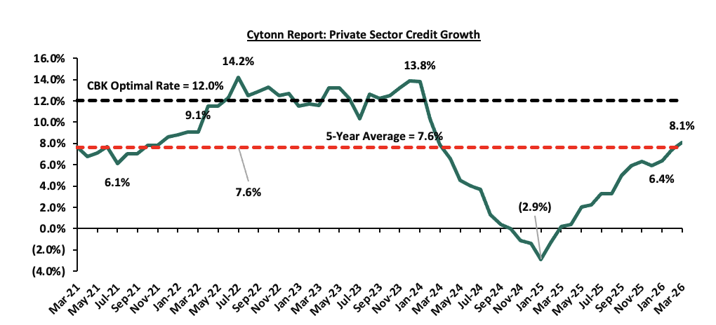 Kenya’s private sector credit growth has staged a notable recovery from its 2.9% contraction in January 2025, climbing steadily to reach 8.1% by March 2026 and finally surpassing the 5-year average of 7.6%. This upward trajectory has been primarily fuelled by the Central Bank of Kenya’s (CBK) decisive easing cycle, which saw the Central Bank Rate (CBR) lowered from 12.75% in August 2024 to 8.75% in April 2026. However, the path toward the 12.0% optimal growth target remains obscured by heightened geopolitical volatility; persistent global conflicts threaten to trigger supply chain disruptions and imported inflation, which may force the MPC to halt further easing to maintain currency stability. Consequently, while the domestic environment currently supports expansion, the outlook for 2026 remains cautiously optimistic as the market must navigate the dual pressures of maintaining momentum and hedging against geopolitical tensions between Iran and US could tighten credit conditions once again.
