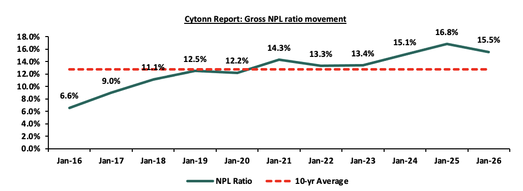 Elevated Credit Risk which contributes to high risk premiums – The high-risk perception prompts lenders to incorporate risk premiums into the interest rates they charge on loans resulting in higher borrowing costs for individuals and businesses seeking credit. The risk premium acts as a cushion for lenders against potential losses, reflecting the level of uncertainty and perceived risk associated with the borrower. Additionally, according to the Central Bank of Kenya (CBK), credit risk reduced with Gross Non-Performing Loans (NPLs) to Gross Loans Ratio standing at 15.5% at the end of January 2026, a 1.3% points decrease from 16.8% recorded at the end of January 2025, attributable to a decrease in gross NPLs of 0.5% compared to an increase in gross loans of 7.7%. The graph below shows the movement for the years under review;