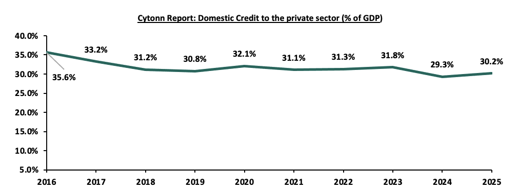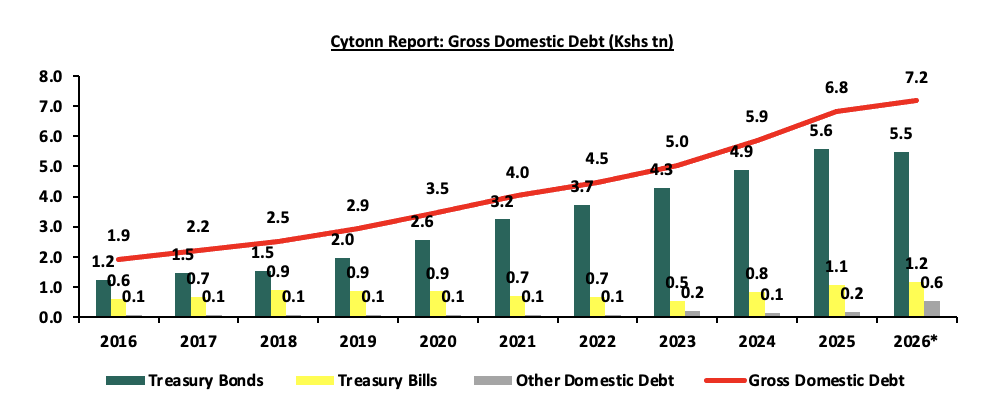 The government’s fiscal policy, particularly its domestic borrowing practices, has a profound effect on private sector credit availability. Heavy government borrowing from the domestic market competes with private sector borrowers for available credit, leading to a crowding-out effect. This occurs when increased government borrowing reduces the funds available for businesses, thereby driving up interest rates and limiting access to affordable credit. As a result, private sector investments are constrained, and financial market stability may be threatened. According to the Central Bank of Kenya (CBK), gross government domestic debt has grown at a 10-year Compounded Annual Growth Rate (CAGR) of 13.5%, reaching Kshs 6.8 tn in 2025 from Kshs 1.9 tn in 2016. The chart below shows the steady growth of gross domestic debt over this period;