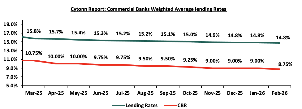 The easing cycle that characterized the period between March 2025 and April 2026 marked a strategic pivot in Kenya’s monetary policy, aimed at reversing the stagnation in private sector borrowing. After the initial 75.0 bps cut to 10.00% in April 2025 from 10.75% in March 2025 set the stage, the Central Bank aggressively accelerated its accommodative stance throughout the year, bringing the CBR down to 8.75% by April 2026. This 400.0 bps total reduction effectively narrowed the spread between the policy rate and commercial lending rates, which dropped to 14.8% from 15.8% in March 2025. While this transmission of lower rates provided much-needed relief to the private sector, the analysis reveals a "lag effect" where lending rates did not fall as fast as the CBR, reflecting banks' cautious assessment of the deteriorating business environment shown in the contracting PMI. By April 2026, the focus has shifted from the availability of cheap credit to the appetite for it, as the positive impact of lower borrowing costs is currently being tested by external inflationary pressures that threaten to stall this downward trajectory. The chart below shows the trend in commercial banks weighted average lending rates between January 2025 and February 2026;