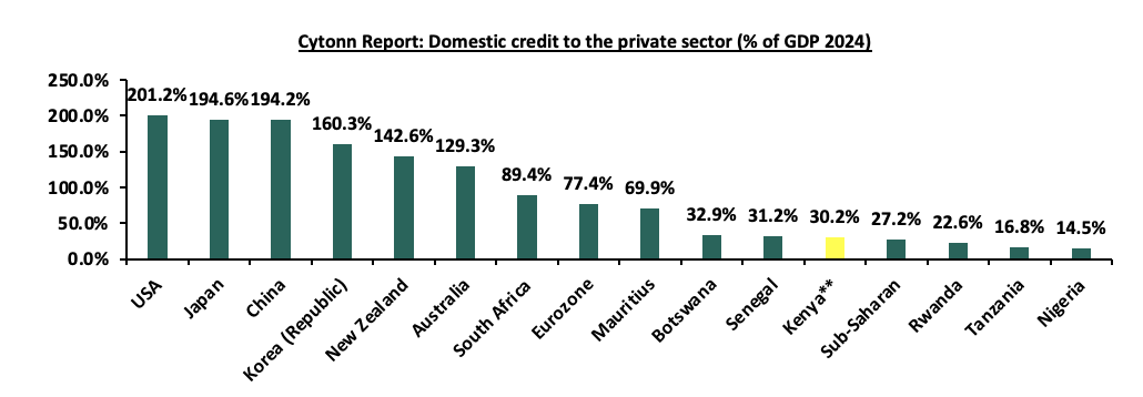 According to the latest data by World Bank, Kenya’s domestic credit extended to the private sector outperformed majority of the Sub-Saharan countries. The Kenya’s domestic credit extended to private sectors as a percentage of the GDP came in at 30.2%, 3.0% points higher than the average Sub-Saharan domestic credit to private sectors lending which stood at 33.4% in the same period. Although Kenya outperformed some of Sub-Saharan countries in credit extended to the private sector, the country still underperformed against developed economies. The graph below shows domestic credit extended to the private sector over the years and a comparison of Kenya’s performance against selected economies;