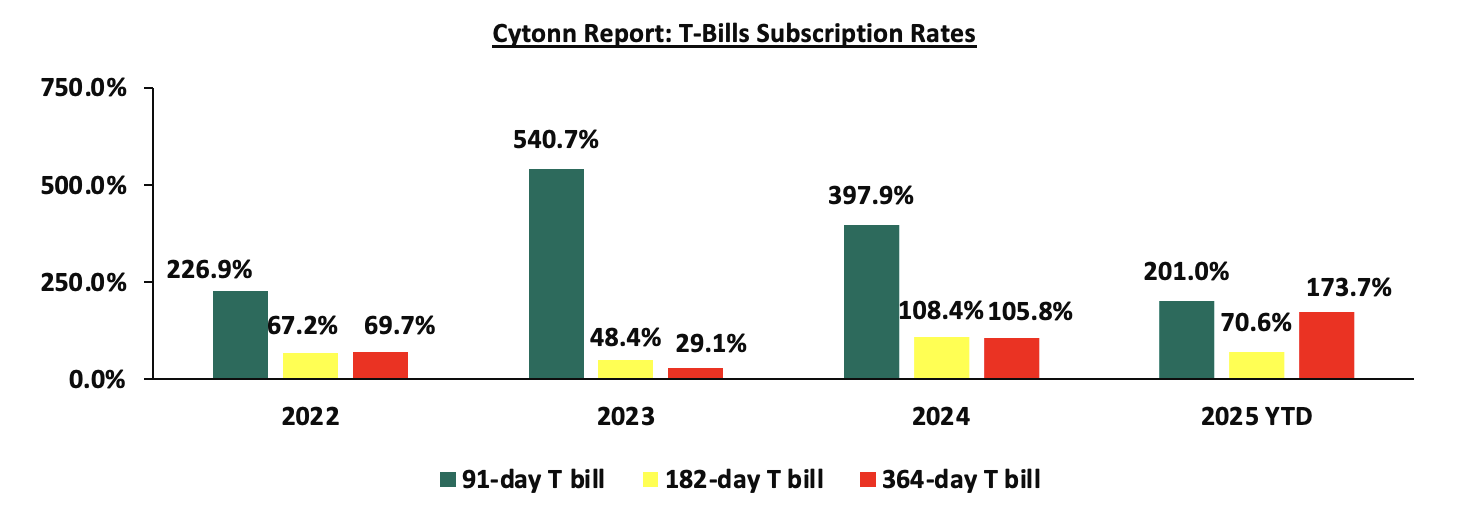 The chart below compares the overall average T-bill subscription rates obtained in 2022,2023, 2024 and 2025 Year-to-date (YTD):