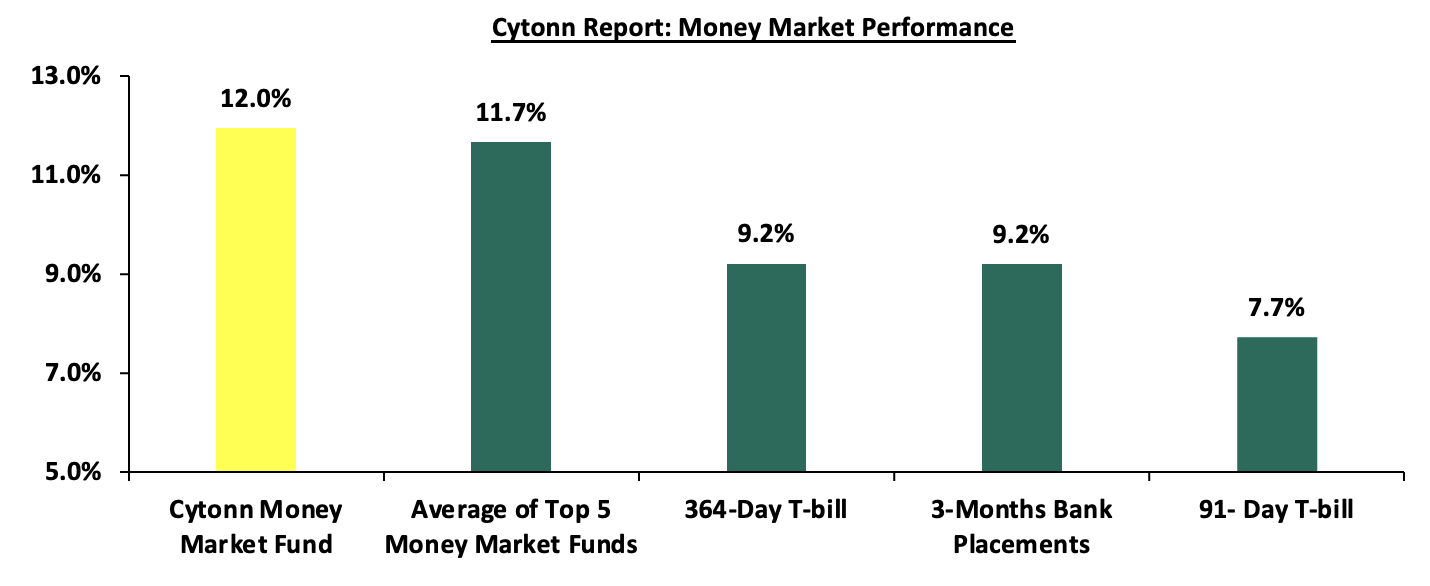 In the money markets, 3-month bank placements ended the week at 9.2% (based on what we have been offered by various banks). The yields on the 91-day and 364-day papers decreased by 4.7 bps and 1.8 bps to 7.7% and 9.21% respectively from the 7.8% and 9.23% recorded the previous week. The yield on the Cytonn Money Market Fund increased by 2.0 bps to 12.0% from the 11.9% recorded in the previous week, while the average yields on the Top 5 Money Market Funds decreased by 3.6 bps to remain unchanged from the 11.7% recorded the previous week.