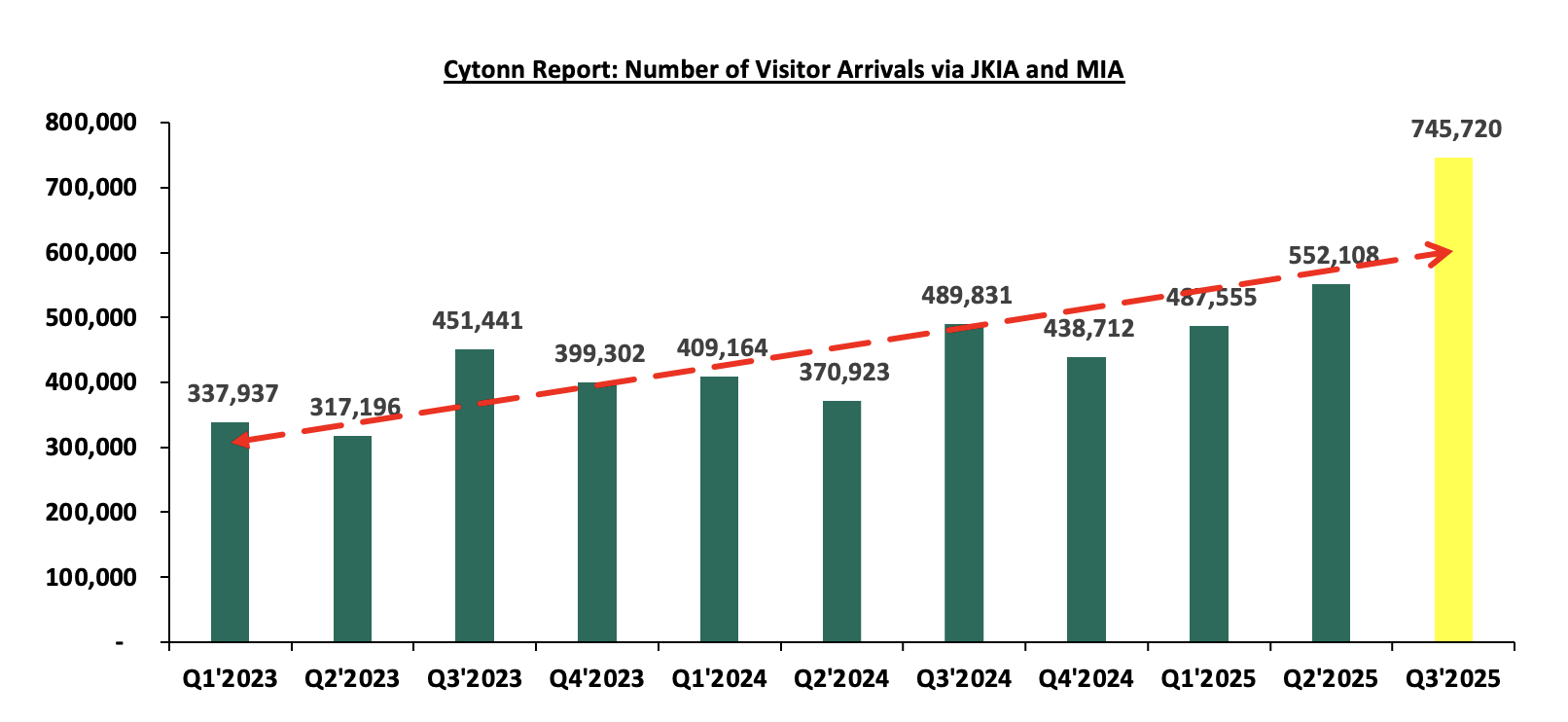 · In terms of international arrivals, Kenya National Bureau of Statistics’ Leading Economic Indicators – September 2025 report highlighted that the number of arrivals was 745,720 reflecting a 35.1% increase from 552,108 arrivals recorded in Q2’2025. On a year-on-year basis, this represented a 52.2% increase compared to 489,831 arrivals in Q3’2024. The improved performance can be attributed to several factors; i) recovery globally in the tourism industry coupled with a strong marketing campaign, ii) visa openness following the introduction of the Electronic Tourist Authorization (eTA) at the beginning of the year, iii) improvements in air connectivity through introduction of new routes and more frequencies by major airlines and the introduction of direct flights by three new airlines—IndiGo (Mumbai-Nairobi), Fly Dubai (Dubai-Mombasa), and Airlink (Johannesburg-Nairobi), iv) the creation of specialized tourism offerings such as cruise, adventure, cultural, and sports tourism, and, v) expanded global promotion of Kenya's tourism by the Ministry of Tourism and the Kenya Tourism Board using platforms like Magical Kenya. The chart below shows the number of international arrivals in Kenya between Q1’2023 and Q3’2025; · While the sector demonstrated resilience in its overall performance in 2025, the outlook remains cautiously optimistic. Kenya continues to face significant competition from neighboring markets, such as Rwanda, which employs aggressive promotional strategies, alongside Zanzibar, Tanzania, and South Africa. These regions actively position themselves as attractive alternatives, challenging Kenya's market share in the region. |