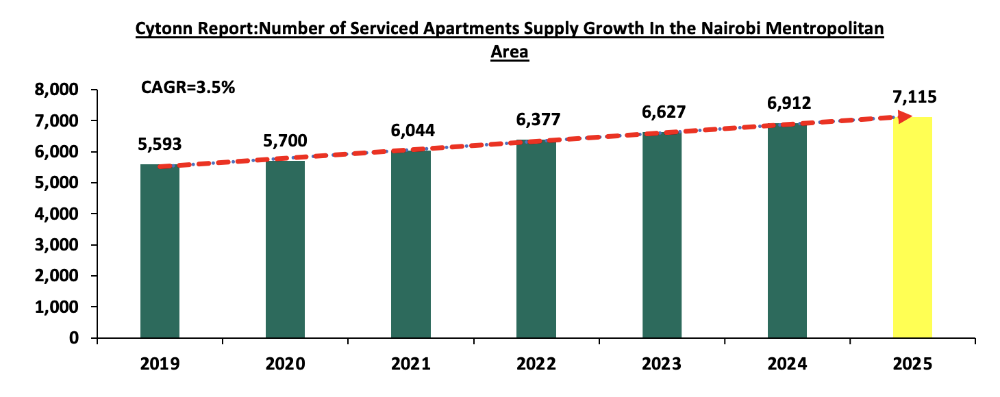 In 2024, we published the Nairobi Metropolitan Area Serviced Apartments Report 2024, which highlighted that the average rental yield for serviced apartments within the NMA increased by 0.5% points to 7.3% in 2024 from 6.8% in 2023. The improvement in performance was primarily on the back of improved occupancy rates and monthly charges by 5.9% points and 3.6%, to 72.2% and Kshs 3,155 per SQM, respectively, in 2024. This week, we update our report using 2025 market research data, in which we discuss and determine the progress, performance, and investment opportunities for serviced apartments in the NMA. In terms of performance, the average rental yield for serviced apartments within the NMA increased by 0.1% points to 7.4% in 2025 from 7.3% recorded in 2024. The improvement in performance was primarily on the back of improved occupancy rates and monthly charges by 2.5% points and 6.7%, to 74.7% and Kshs 3,366 per SQM, respectively, in 2025;