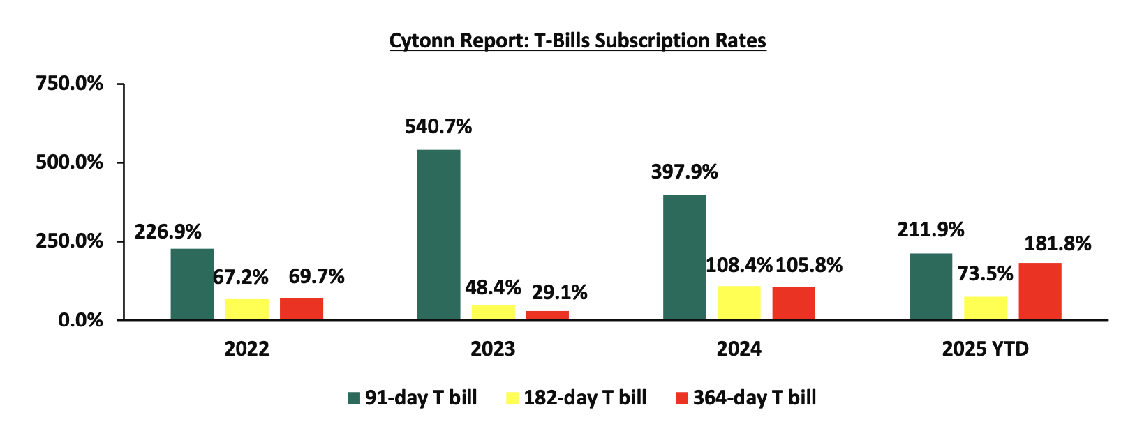 The chart below compares the overall average T-bill subscription rates obtained in 2022,2023, 2024 and 2025 Year-to-date (YTD):