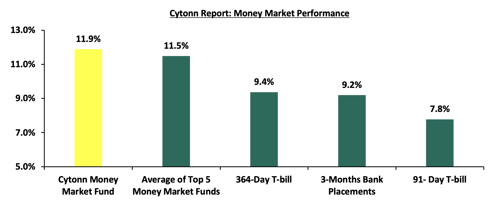 In the money markets, 3-month bank placements ended the week at 9.2% (based on what we have been offered by various banks). The yields on the 91-day paper increased marginally by 0.1 bps to remain relatively unchanged from 7.78% recorded the previous week with yields on the 364-day paper decreasing by 0.8 bps to 9.37% from the 9.38% recorded the previous week. The yield on the Cytonn Money Market Fund decreased by 11.0 bps to 11.9% from 12.0% recorded in the previous week, while the average yields on the Top 5 Money Market Funds decreased by 4.8 bps to remain unchanged from 11.5% recorded the previous week.