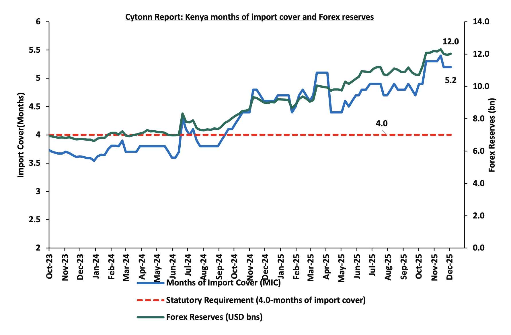 During the week, the Central Bank of Kenya released the auction results for the re-opened treasury bonds SDB1/2011/030 and FXD1/2021/025 with tenors to maturities of 15.2 years and 20.4 years respectively and fixed coupon rates of 12.0% and 13.9 % respectively. The bonds were oversubscribed, with the overall subscription rate coming in at 132.8%, receiving bids worth Kshs 53.1 bn against the offered Kshs 40.0 bn. The government accepted bids worth Kshs 47.1 bn, translating to an acceptance rate of 88.7%. The weighted average yield for the accepted bids for the SDB1/2011/030 and FXD1/2021/025 came in at 13.3% and 13.6% respectively. Notably, the 13.3% on the SDB1/2011/030 was lower than the 14.0% recorded the last time the bond was reopened in June 2025 while the 13.6% on the FXD1/2021/025 was lower than the 13.8% recorded the last time the bond was reopened in October 2021;