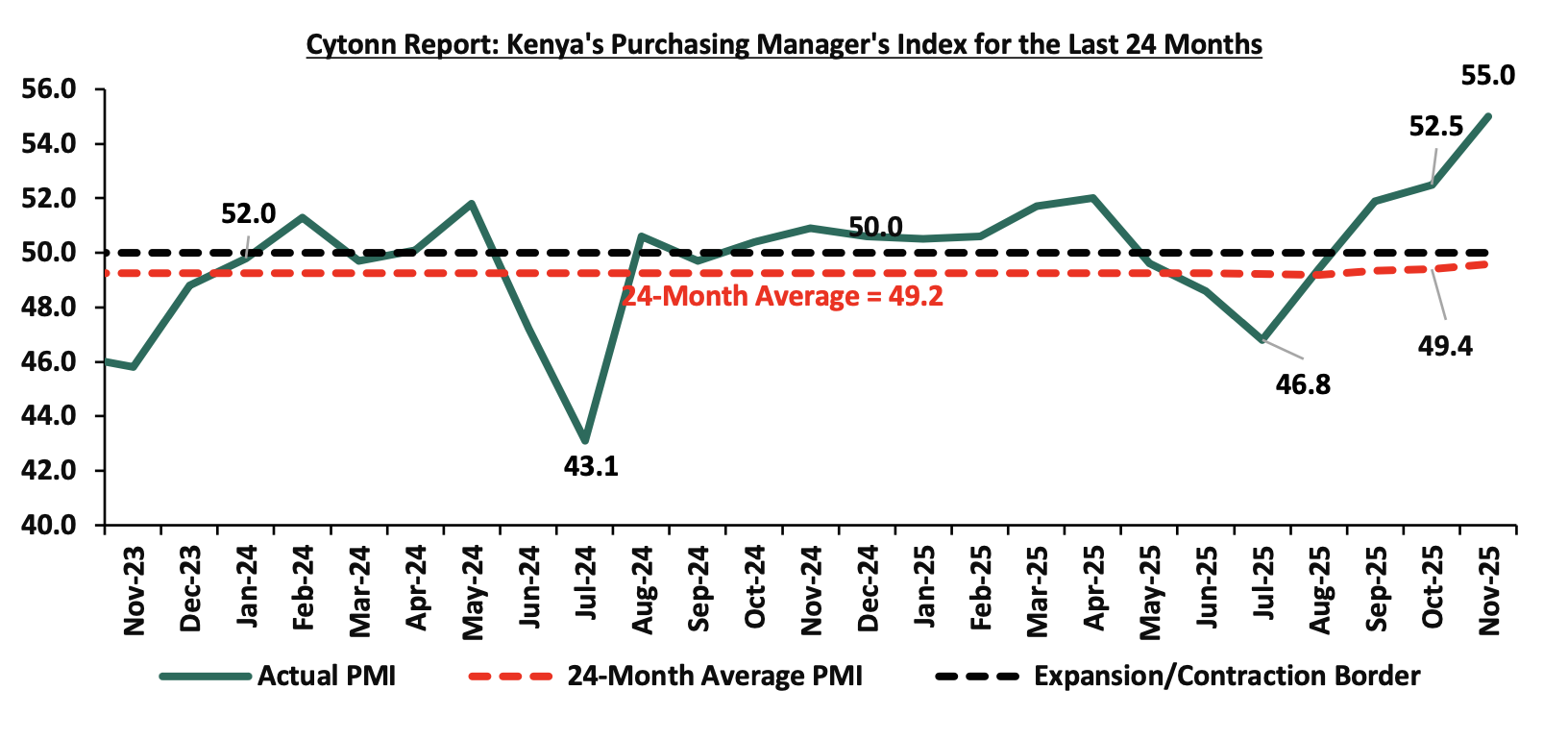 During the week, Stanbic Bank released its monthly Purchasing Managers’ Index (PMI) highlighting that the index for November 2025 rose further into expansion territory, coming in at 55.0, up from 52.5 in October 2025. This marked the third consecutive month of improvement and the highest since February 2022, signaling a solid upturn in business conditions across Kenya’s private sector. The improvement was mainly driven by stronger demand, higher new orders and increased output levels, supported by easing inflationary pressures and improved supply chain efficiency;