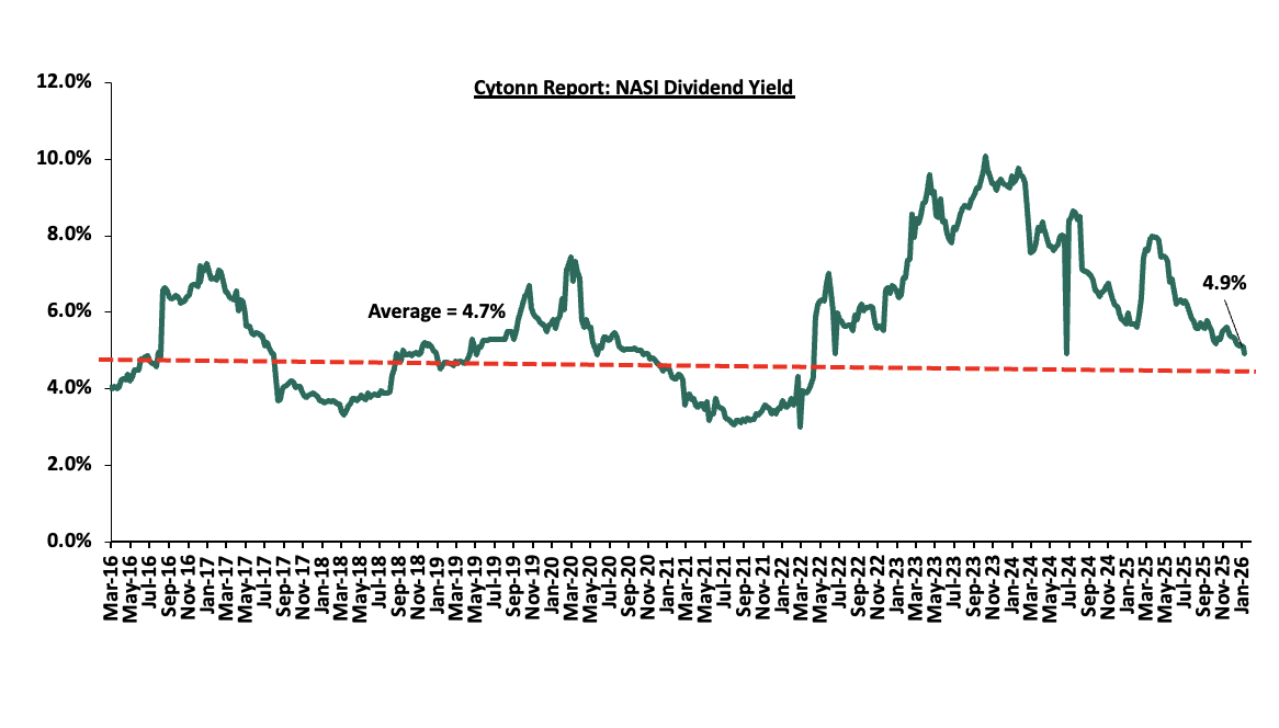 During the week, Kenya Power & Lighting Company Plc (KPLC) released its HY’2026 financial results, recording an 4.3% increase in profitability to Kshs 10.4 bn, up from Kshs 10.0 bn in HY’2025. The performance was mainly attributable to a 5.9% increase in gross profit to Kshs 38.2 bn, from Kshs 36.0 bn in HY’2025 coupled with a 25.0% decrease in finance costs to Kshs 1.5 bn from the Kshs 2.0 bn in H1’ 2025;