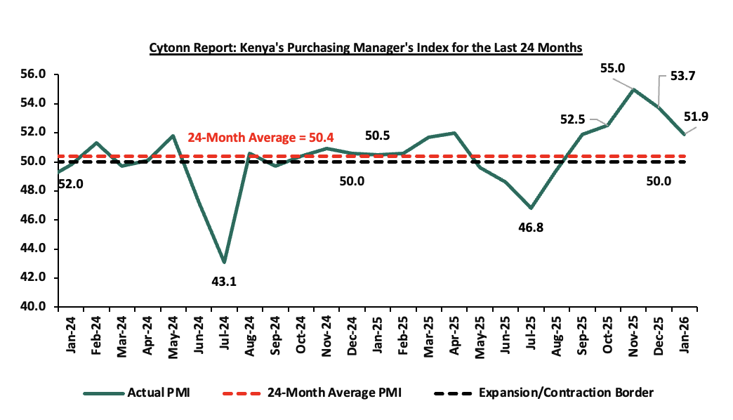 During the week, Stanbic Bank released its monthly Purchasing Manager’s Index (PMI), highlighting that the index for the month of January 2026 remained in expansion territory, coming in at 51.9, albeit lower than 53.7 recorded in December 2025, marking the fifth consecutive month the index remained above the 50.0 neutral mark, signaling a sustained improvement in business conditions, mainly attributable to continued growth in output and new orders;