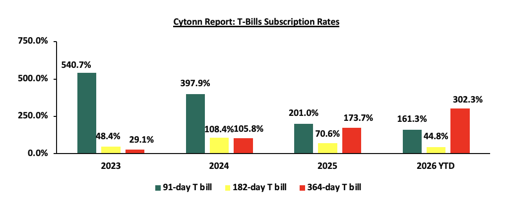 The chart below compares the overall average T-bill subscription rates obtained in 2023, 2024, 2025 and 2026 Year-to-date (YTD):