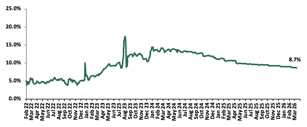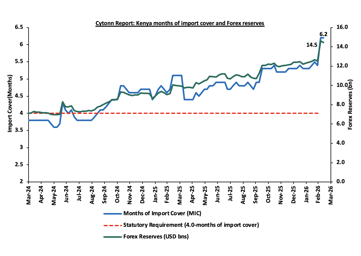 During the week, the Central Bank of Kenya released the auction results for the re-opened treasury bonds FXD1/2019/020 and FXD1/2021/025 with tenors to maturities of 13.1 years and 20.1 years respectively and fixed coupon rates of 12.9% and 13.9% respectively. The bonds were oversubscribed, with the overall subscription rate coming in at 195.7%, receiving bids worth Kshs 117.4 bn against the offered Kshs 60.0 bn. The government accepted bids worth Kshs 61.0 bn, translating to an acceptance rate of 51.9%. The weighted average yield for the accepted bids for the FXD1/2019/020 and FXD1/2021/025 came in at 12.7% and 12.9% respectively. Notably, the 12.7% on FXD1/2019/020 was lower than the 13.3% recorded the last time the bond was reopened in January 2026 as well as the 12.9% on the FXD1/2021/025 which was also lower than the 13.6% recorded the last time the bond was reopened in December 2025. With the Inflation rate at 4.3% as of February 2026, the real returns of the FXD1/2019/020 and FXD1/2021/025 are 8.4% and 8.6%. Given the 10.0% withholding tax on the bonds, the tax equivalent yields for shorter term bonds with 15.0% withholding tax are 13.5% and 13.7% for the FXD1/2019/020 and FXD1/2021/025 respectively;