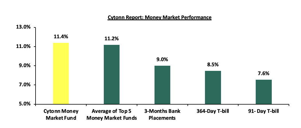 In the money markets, 3-month bank placements ended the week at 9.0% (based on rates offered by various banks). The yields on the 364-day paper decreased by 16.3 bps to 8.5% from 8.6% recorded the previous week, while the yields on the 91-day paper decreased by 1.6 bps to remain relatively unchanged from the 7.6% recorded the previous week. The yield on the Cytonn Money Market Fund remain unchanged at 11.4% recorded the previous week, while the average yields on the Top 5 Money Market Funds decreased by 0.2 bps to remain relatively unchanged at 11.2% recorded the previous week.